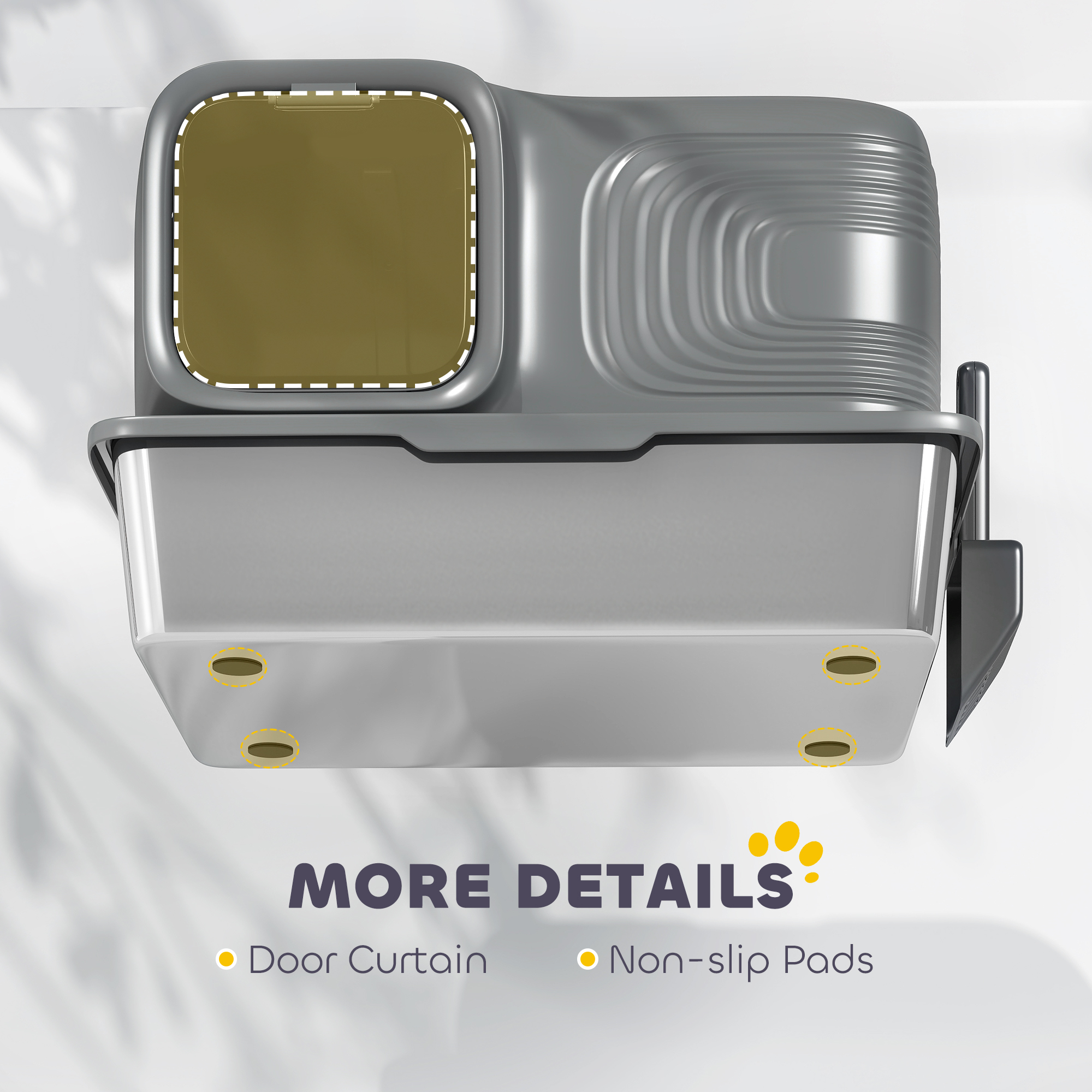 Discover the effortless cleaning of the PawHut stainless steel cat litter box. With its solid stainless steel tray and handy scoop, keeping it clean is a doddle, ensuring your cat's paws remain clean. Enjoy a fresher home, thanks to the smart top entrance and enclosed design that effectively prevent leaks and controls odours. Great for larger feline companions up to 9 kg, this spacious cat toilet combines practicality with comfort, making both you and your kitty happy.